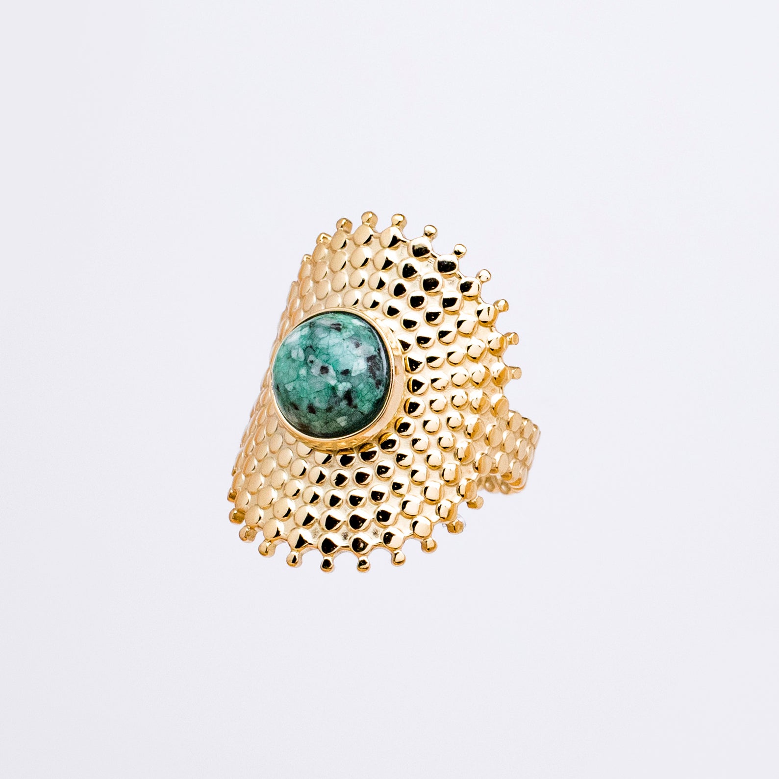 Nuestro extraordinario anillo ajustable de acero inoxidable, que encarna la elegancia intemporal de los camafeos vintage. Inspirado en la época dorada de la alta joyería, este diseño exquisito evoca la opulencia y el encanto de antaño. El anillo está meticulosamente confeccionado en acero inoxidable de la más alta calidad, asegurando su durabilidad y brillo perdurable. Su diseño ajustable permite un ajuste perfecto y cómodo, adaptándose con gracia y estilo a cualquier dedo. El corazón de esta joya deslumbrante es una medalla cautivadora, cuidadosamente esculpida con un aire de misterio y sofisticación. Inspirada en los camafeos vintage, su diseño presenta una exquisita combinación de detalles intrincados y delicados. En su parte central, una piedra ágata verde musgo agrega un toque de distinción y originalidad. Con su tono verde intenso y sus tonalidades sutiles, esta piedra evoca la serenidad y la conexión con la naturaleza, aportando una energía cautivadora al conjunto.